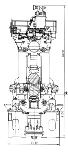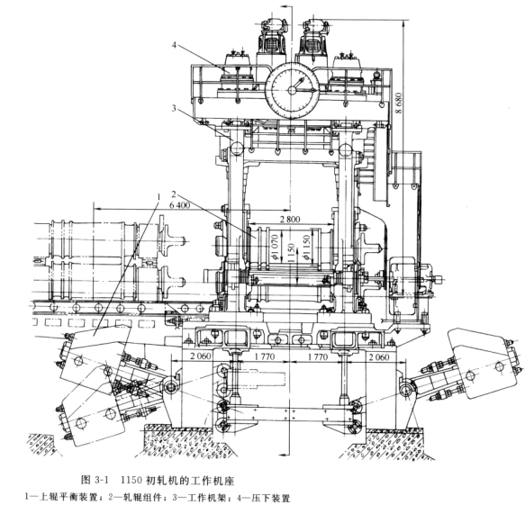 國產1150初軋機的主傳動形式為兩個低速直流電動機(功率4560kw,轉速0-70-120r/min)通過萬向連接軸分別傳遞兩個軋輥。上軋輥的主連軸器放在下軋輥主電機的上面。工作滾名義直徑為φ150mm,重車后較小直徑為φ1080mm,輥身長度為2800mm。1150初軋機的工作機座如圖3-1所示。他是由軋輥部件,機架部件,壓下平衡裝置等組成,但是每個部件都有其自己的特點,與板帶軋機和型鋼軋機不同。