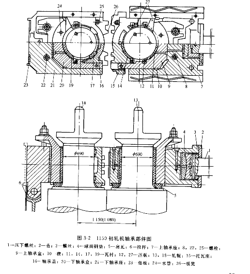 下軋輥放置在下軸承盒 20 與軸承蓋 16 之間。 下軸承盒承受軋制力,所以有較大的徑向瓦襯 19,軸承蓋 16不受力,只起防塵防鐵鱗的作用,所以僅有兩條很小的瓦襯 17。軸承蓋與下軸承盒用螺栓 25 相連接。下軸承盒上同樣有兩個下突耳,通過螺栓 22 進行軸向調整。下軸承座 21 在軋輾側設有法蘭,換輥時與軋輥、軸承盒等一起抽出。在軋制過程中下軸承座用固定在機架上夠