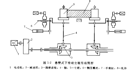 懸臂式下傳動立輥結(jié)構(gòu)簡單,換輾方便,-一般在板坯厚度小于 100~150mm 時采用。圖5-2 所示為懸臂式下傳動立輥傳動簡圖。懸臂固定在軸 4上的立輥5,是由電動機 1通過減速機 2 和圓錐齒輪3 傳動。調(diào)節(jié)軋輥開口度時,在側(cè)壓螺絲 6 的作用下,軋輥的平衡是用平衡缸 7來實現(xiàn)的。