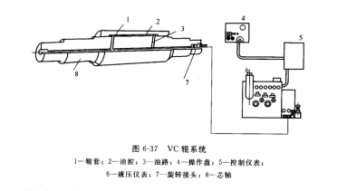 VC輥系統(tǒng)(圖 6-37)由 VC輥、液壓動力裝置、控制裝置和操作盤等組成。VC輥包括輥套、芯軸、油腔、油路和旋轉(zhuǎn)接頭等。在輥套和芯軸之間是油腔,軸套兩端緊密地?zé)嵫b在芯軸上,以便使其在承受軋制力的同時能耐高壓密封。液壓動力裝置的高壓油經(jīng)旋轉(zhuǎn)接頭向輥子供油,通過控制高壓油使輥套膨脹,以補償軋輥撓度。油壓為0~50MPa,軋輥凸度在較大壓力下,沿半徑方向較大凸度軋鋼時可達(dá)0.27mm,軋鋁時可達(dá)0.33mm。