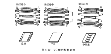 由于四輾軋機(jī)軋制負(fù)荷大,且工作輥直徑較小,因此,在一般四輾軋機(jī)上,都將支承輥用作 VC輥。其控制方法如圖6-39 所示,控制原理如圖 6-40 所示。油壓過小將使帶材產(chǎn)生邊浪,油壓過大將使帶材產(chǎn)生中間浪,只有油壓適中,才能獲得平直的帶材。