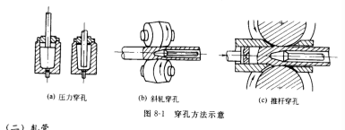即將實(shí)心管壞穿孔成空心毛管。常見的管壞穿孔方法有斜軋穿孔(二輾、狄舍爾和三輾)、壓力穿孔和推桿穿孔 (PPM) 等三種,如圖 8-1 所示。另外還有直接采用離心澆注,連鑄與電渣重熔等方法獲得空心管坯,而省去穿孔工序。
