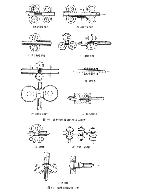 軋,管是將空心毛管軋成接近成品尺寸的荒管。常見的軋管方法有自動(dòng)軋管機(jī)、連續(xù)式軋管機(jī)(全浮動(dòng)式 MM、限動(dòng)心棒 MPM)、皮爾格軋管機(jī)(周期式軋管機(jī))、三輾軋管機(jī)、狄舍爾軋管機(jī)、頂管機(jī)和鋼熱擠壓機(jī),如圖 8-2所示。